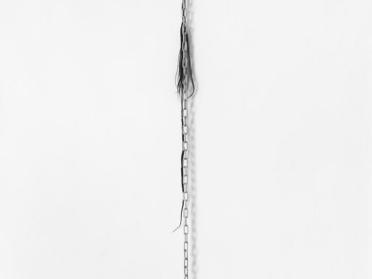 Elephant Memory #1 consists of a long braid of synthetic hair running along a galvanised steel chain suspended from a wall by a hook. The braid recalls Black hairstyles and Diamond Stingily’s mother’s hairdressing salon, where she spent her childhood, highlighting the work of passing on knowledge in a matrilineal lineage. The title of the work also refers to the social organisation of elephants: in the herd, codependence is established within a specific matriarchal system, which echoes the artist’s relationship with the transmission of female heritage. This work, with its autobiographical echoes, evokes entangled connections, shackles, and the question of passing on knowledge. Elephant Memory #1 is part of a group of dozens of works that take up the same theme in different forms of chains and braids.