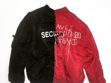Vava Dudu’s work touches as much on clothing and accessories as it does on music, painting and drawing. Her underground universe flirts with mass media and mixes text and images. Her work as an independent stylist as well as a singer in the band La Chatte, founded in 2003, makes up an artistic universe that claims a detachment from any utilitarian function. The pair of two-tone Bomber jackets Untitled (secu) and Untitled (rity) was designed in a spirit of reciprocity, to be worn by two friends. The jacket’s initial function of providing security, deduced by the word “SECURITY”, is hijacked, not without humour, by splitting the garment in two, and by a phrase, hand-embroidered by the artist, which alludes to the gaze and suggests a non-verbal language.