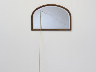 The work Sign presents a mirror framed in wood hanging on a white wall. Its surface reflects a pile of objects in a studio with a window at the back. This production makes use of Alicja Kwade’s favoured materials—glass, wood, and metal. The mirror photographed in this way sees its original function transformed. More than a reflection of the composition, it acts as a frame into which a painting has been inserted. Its isolated position on the white wall accentuates this illusion by referencing the hanging of paintings in museums, a presentation that disorients the audience’s gaze. Sign thus preserves a great mystery characteristic of Alicja Kwade’s work and her interest in aporias (from the ancient Greek aporos, meaning “without passage”), those philosophical or scientific theories to which it is absolutely impossible to provide an answer.