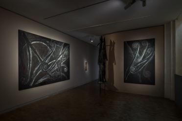 While the courtyard is occupied by Michèle Lamy’s new totemic sculpture, this first floor is where the ancestral rituals enter into dialogue with more recent ones, and elements of the occult, alchemy, divination, natural healing, fertility, and Earth rites are bound together into one circle through works by Bianca Bondi, Ana Mendieta, Wifredo Lam, and Hildegard von Bingen. The ceremony pulls us back through the layers of space and time to the Cycladic sculptures evoking the worship of a fertility goddess and the sacred celestial body of Tau Lewis’s tapestry, speaking of a world in an endless cycle of metamorphosis. Mysterious universes, totems, magnetic forces emanating from parallel worlds and symbols created in a ritualistic, intuitive process point beyond the darkness of the now in works by TARWUK, Jeanne Vicerial, Anna Zemánková, and Janina Kraupe-Świderska. They are a meditation on the transformative potential of rituals and the poetics of spirituality, while Matthew Angelo Harrison’s and Christelle Oyiri’s ritualistic objects and masks pose questions around ceremonial traditions and the notion of faith in relation to colonial histories.