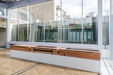 For this exhibition at Lafayette Anticipations, his first large-scale show in Paris, Camille Blatrix was invited to occupy the top level of the glass exhibition tower, designed by Rem Koolhaas. This transparent space overlooking the surrounding rooftops has something of a penthouse feel, where power and opulence have reached their limit, and must be replaced by other conquests, a possible redemption, or a spiritual, mystical quest. At the centre of this peculiar interior, an ambiguous sculpture — suggesting a succession of high-tech kitchen islands — presents the fundamental elements of life (water, fire, air, etc.) like as many stages in some unknown rite of passage. Fortune is Camille Blatrix's first solo show at a major art venue in France. It in fact carries on a longstanding dialogue between the artist and Lafayette Anticipations, after Joining Forces with the Unknown, a pre-opening show in 2016, and the semi-permanent work he created for the lower ground-floor gallery in 2018. All the works in this new project were produced on-site, in the Lafayette Anticipations studios.