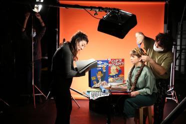 On a parlé du cadre global qui serait le plateau télé, on a parlé des éléments spécifiques, les accessoires et le décor qui viennent animer ce plateau télé. Parlons maintenant des scènes. parce que tous tes films sont des séries de scénettes, et là en l'occurrence il y en a un certain nombre qui répondent aux textes que tu as pu écrire soit toute seule, soit en collaboration avec les participant·e·s du projet. Est-ce que tu peux nous guider un peu à travers ces scènes ?