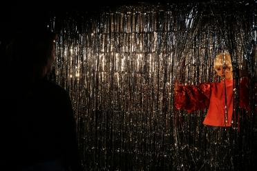 La chose la plus excitante pour moi c'est de garder une distance avec le costume et d'avoir un lien, une espace au féminin d'ailleurs. “Une” espace c’est contenu, un espace c’est ouvert et donc une espace contenu entre un costume et moi, c'est un lieu, c'est une salle d'échange, c'est un parloir, presque. Donc voilà, moi, j'avais besoin de ça, j'avais envie de cette distance, que les gens soient costumés et que ça se voit. Et Garush a accentué tout ça avec cette esthétique de maquillage nacré, de rouge, de vernis. Ça a été très précis, on n'a pas laissé au hasard le moindre détail.