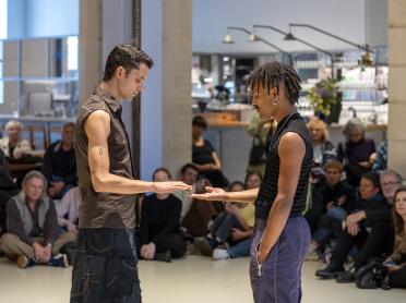 Each iteration of the performance is choreographed in collaboration with the performers and tailored to the duo - with a special version created for the Échelle Humaine festival at Lafayette Anticipations, performed by dancers Malick Cissé and Andréa Givanovitch.
