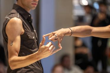 The figures formed between the hands of the performers are at times recognisable as an intimate touch and at others as abstract figures of relationality and entanglement.