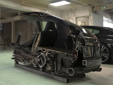The Porsche Panamera cut into four pieces like a cake testifies a sacrificial gesture imposed unpon a mass-produced luxury object elevated onto the alter of art. Yngve Holen set out to work with a Porsche Panamera, which is promoted as a hybrid between a family and a sports car and, because of this, is unique in its kind.