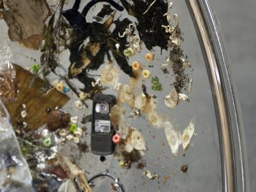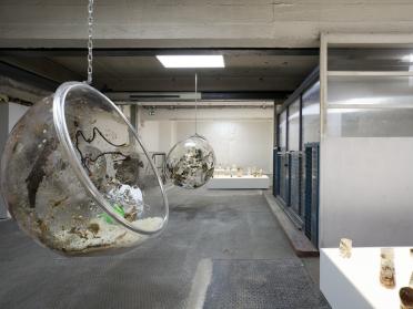 Medium: Plexiglass bubble chairs, orgonites, resin, found objects, plants, trash