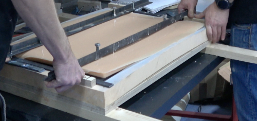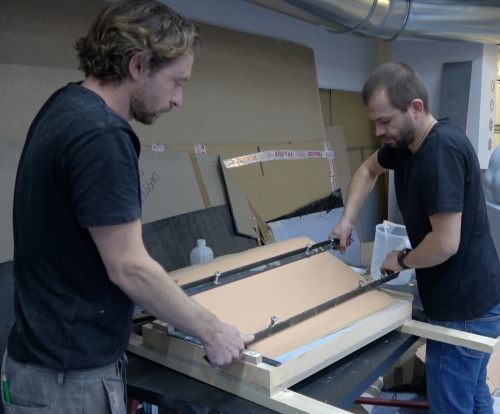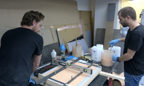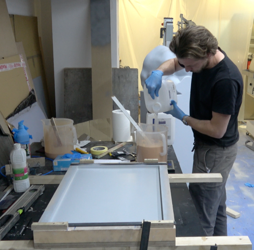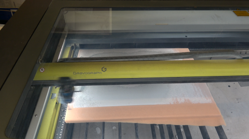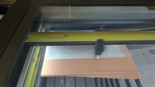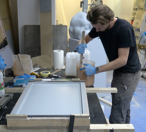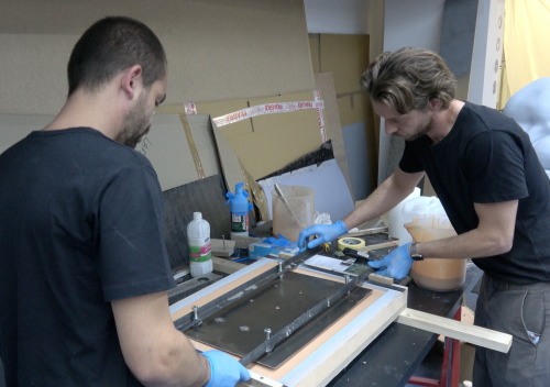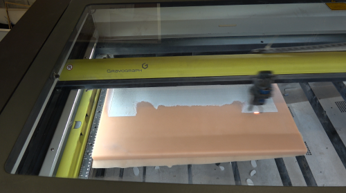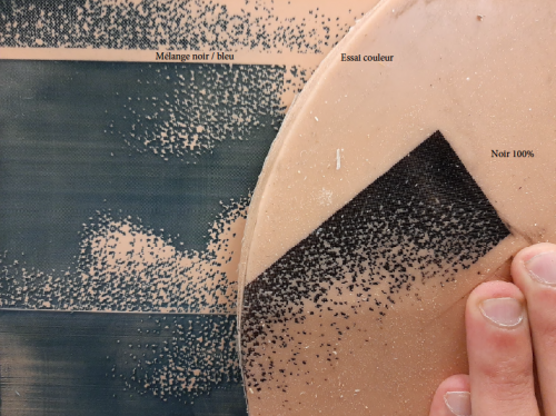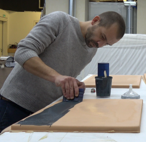On enlève l'encre projetée au laser. Le silicone conserve l'impact de la projection créant ainsi un épiderme sur la plaque.