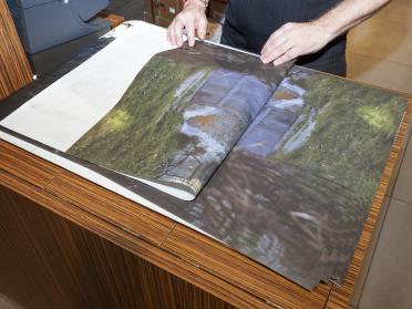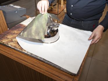 The action of layering ideas and materials is inherent within Scott Myles’ artistic practice. With “Potlatch”, the artist wishes to initiate a subtle intervention that involves the wrapping and containment of objects, and the gifting of an artwork within a situation of commerce. “Potlatch” entails the temporary replacement of the white tissue paper used to wrap purchased goods in Lafayette Maison with stacks printed with twelve colour photographs of Guy Debord’s home, took in Champot. Participation in the project occurs when someone purchases goods in the department store.