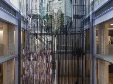 Explication du système de suspension de "Space Loom" dans la tour centrale de Lafayette Anticipations