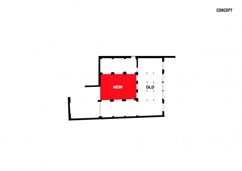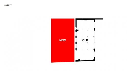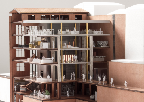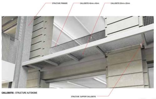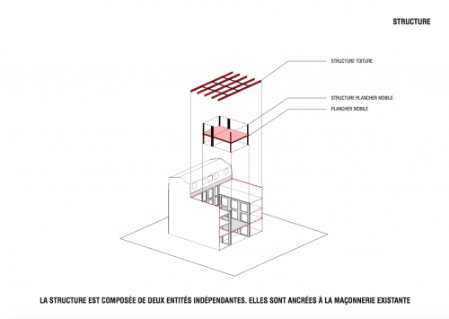 Une « tour d’exposition » équipée de quatre planchers mobiles superposés est insérée dans l’emprise de la cour du bâtiment. Grâce à leur moteur embarqué, les planchers se déplacent indépendamment le long de crémaillères et peuvent être stationnés dans l’alignement des niveaux existants.