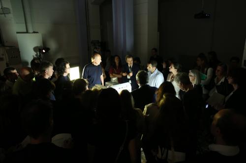 Ce jeu innovant de plateformes permet, au fil des expositions, de modifier l’espace en 49 configurations différentes. Ces multiples possibilités de respiration verticale répondent à un souhait de flexibilité et d’adaptation aux nombreux projets en cours et à venir. Avec ses 875m2 de surfaces d’exposition, cette machine à exposer vient compléter l’autre composante fondamentale de Lafayette Anticipations ; son centre de production situé au sous-sol, où sont fabriquées les œuvres conçues par les artistes invités. L’utilisation simultanée de ces deux dispositifs permet la création d’œuvres inédites, conçues pour une configuration d’exposition idoine.