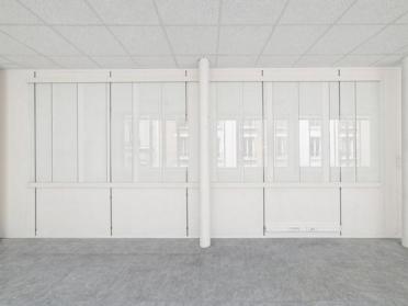 Cette installation in situ témoigne de l’expérience d’Élodie Seguin dans l’atelier qu’elle a investi lors de sa résidence à la Fondation d’entreprise Galeries Lafayette en 2014. Par l’apposition de vitres sur l’un des murs, l’artiste crée une symétrie qui souligne la longueur de la pièce. Le bâtiment d’en face s’y reflète au point de se trouver presque calqué entre les murs de l’atelier. Cette esthétique déplace au-delà des surfaces le vocabulaire de la vitre et du mur préfabriqué qui imprègne le deuxième étage de la Fondation. L’œuvre a été produite pour l’exposition Venir Voir Venir organisée à la Fondation en juillet 2014.