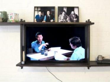 Sur une étagère de style japonais, un téléviseur diffuse Rehearsal for a Reunion. Il est entouré d’objets issus de la cérémonie du thé, d’un livre du céramiste Bernard Leach ainsi que de deux photographies : l’une où Simon Fujiwara pose avec son père, l’autre où l’on voit Bernard Leach aux côtés de son ami Shoji Hamada. Nœud de l’installation, la vidéo montre l’artiste et un acteur. Scripts à la main, les deux hommes répètent la scène autour d’un service à thé : il s’agit des retrouvailles entre l’artiste et son père après vingt ans de séparation. Pour célébrer leur réconciliation, père et fils ont réalisé la copie d’un service à thé de Bernard Leach dont le style synthétise les esthétiques orientales et occidentales. En rattachant cette spécificité à sa propre expérience, Simon Fujiwara fait du service à thé le symbole de sa filiation et de sa double culture anglo-japonaise. Entre réalité et fiction, son travail procède d’une réflexion sur les relations interculturelles et intergénérationnelles.