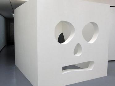 Sans titre est un cube en bois peint en blanc qui comporte quatre faces percées d’ouvertures géométriques laissant apparaître les traits d’un visage schématique. Sa couleur et l’expression qu’il dégage lui donnent un air spectral. La sculpture-visage est regardée par nous, mais elle regarde aussi l’espace d’exposition ou ses visiteurs en générant de nouveaux points de vue. Sans titre est un instrument-miroir qui nous renvoie notre propre image et à nos mécanismes d’interprétation, Mathieu Mercier exigeant du spectateur une lecture personnelle, voire introspective de l’œuvre. Ce cube blanc évoque aussi le white cube, aménagement blanc et neutre des lieux de monstration de l’art dans les années 1960.