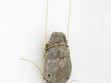 Le travail de Petrit Halilaj se nourrit d’un rapport intime, mémoriel et anthropologique à la terre natale. La sienne – le Kosovo – représente le matériau d’une œuvre qu’il construit avec l’intensité de la résilience dont sont doués celles et ceux que l’histoire déplace. Chacune de ses productions porte le récit d’une époque bientôt révolue, d’un espace et d’une culture en mutation. Si Okarina e Runikut est tant œuvre qu’instrument de musique. Réalisé grâce à l’enseignement transmis à l’artiste par Shaqir Hoti, l’un de ses derniers fabricants kosovars, l’ocarina de Petrit Halilaj est un symbole de la culture propre au Kosovo : fabriqué en argile depuis l’époque néolithique, cet instrument typique est l’une des idiosyncrasies de son pays que l’artiste porte à notre connaissance et notre écoute. Muni d’un lien en laiton, l’instrument peut être suspendu, en prise au vent qui activera cette œuvre porteuse de savoirs ancestraux transmis par culture orale. Loin de dépeindre les tourments de son pays, Petrit Halilaj s’attache dans ses œuvres à montrer des fragments de sa culture, éclipsée de nos mémoires et nos représentations par les conflits des années 1990.