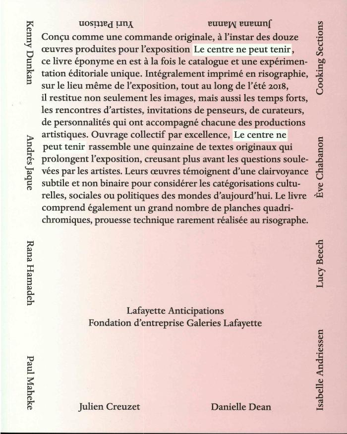 Les catalogues édités par Lafayette Anticipations accompagnent les expositions, imprimés ou non dans nos ateliers, ils sont pensés comme des objets uniques, fruits de la collaboration entre la Fondation et les artistes. Chaque catalogue fait l’objet d’un design graphique spécifique et d’un format qui lui est propre. Richement illustrés de vues d’exposition, ils proposent également une série de textes d’auteur.rice.s et critiques internationaux.ales en français et en anglais.