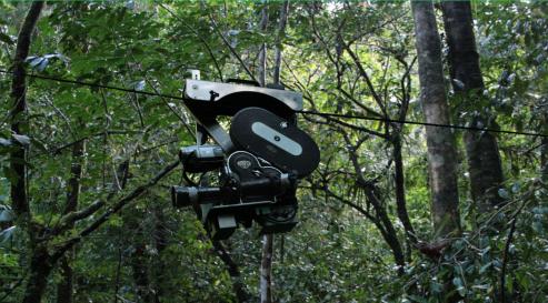 Dans cet enclos aux formes antagoniques, on suit le comportement des insectes qui tentent avec lenteur d’inventer une nouvelle écologie mimétique. Phénoménologie On comprend combien que la perception est pour l’artiste un sujet fondamental. L’environnement, mot souvent utilisé pour qualifier notre fragile destinée commune, réclame avant tout d’exercer sur tout ce qui nous environne une conscience qui nous engage physiquement dans une projection, un déplacement, une aliénation salutaire. L’installation Orange Orange 2, 2004, présentait lors de sa première exposition en France, dans un espace baigné de couleur « summer blue », une structure recouverte de filtres photographiques oranges, dans laquelle était servi du jus d’orange. Comment la couleur influe-t-elle sur l’entendement du monde, par la vision, le déplacement jusqu’à l’absorption ?Plusieurs versions d’une œuvre au titre imprononçable, (‘(^, 2008, ont déjà fait l’objet d’expositions. Il s’agit de rideaux de fines chaines colorées, desquelles pendent des formes créant des ouvertures en enfilades. Le visiteur est invité à une traversée et à observer la nature changeante des phénomènes chromatiques perçus en relation à notre propre déplacement, induisant avec l’œuvre d’art une relation dynamique de transformation mutuelle.LignesL’œuvre Equal (Cut), 2008 est une intervention dans l’entrée d’un espace d’art alternatif de Rio, Ateliê397. L’artiste a disqué le sol, créant une rainure traversant obliquement la courette jusqu’à l’intérieur du bâtiment, dans l’interstice de laquelle poussent des plantes invasives, comme un rhizome en droite ligne.L’installation filmique qui s’intitule 16 MM, 2009-11, marque aussi l’imposition d’une ligne droite, mais cette fois au cœur même de la nature. Dans le même carré amazonien décrit plus haut de l’œuvre Phantom, l’artiste a tendu un câble de 60,96 mètres, longueur exacte d’une bobine standard de film 16mm. La caméra suspendue, glisse le long du câble à la vitesse de roulement de la pellicule. La perception de l’image et du son qui restitue un fourmillement intense d’une forêt indifférente à notre regard, est en parfaite conjonction avec le défilement mécanique des images. Le visiteur est littéralement saisi par l'incantation tumultueuse de vie, par la myriade de bruits et de formes où la survie n’est possible que dans l’équilibre et la réciprocité des forces, ce qui, pour Daniel Steegmann Mangrané, au-delà de la fascination pour les lois de la nature, se propose également comme le modèle nouveau d’une possible société de partage.1 – Eduardo Viveiros De Castro, « Perspectivisme et multinaturalisme en Amérique indigène », Journal des anthropologues, 20142 – Georges Didi-Hubermann, Phasmes , Essai sur l’apparition, Les Éditions de Minuit, 19983 – Exposition Animal que no existeix, Daniel Steegmann Mangrané, CRAC, Centre Rhénan d’art Contemporain, Alsace, 19 oct 2014 au 18 janvier 2015, Commissariat : Elfi Turpin.