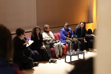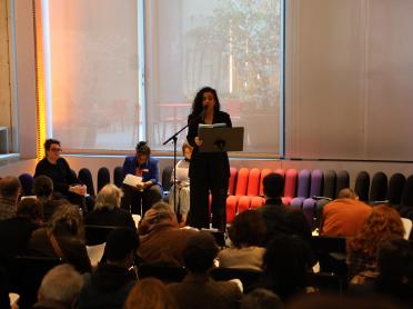 Claire Stavaux, directrice de la maison depuis 2017, anime une rencontre réunissant les trois autrices Joëlle Sambi, Sonia Chiambretto et Athena Farrokhzad.