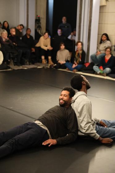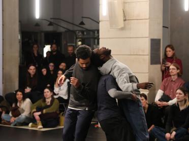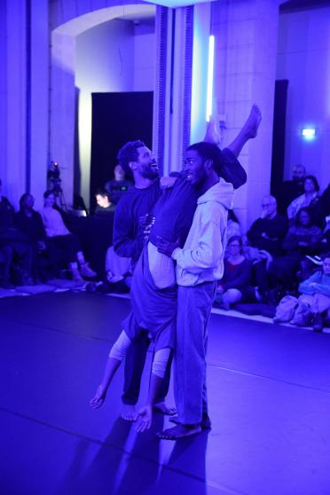 Les interprètes JaLeel Marques Porcha et Andros Zins-Browne utilisent la répétition et le jeu pour explorer comment les vies et les géographies noires sont souvent ignorées ou rendues insaisissables par les cadres coloniaux, et comment d'autres formes de relation peuvent émerger. Conçue par Jemison, la performance Cynosure mobilise la parole pour évoquer - tout en déjouant - une conception de la position du corps ou du sujet invitant ainsi le public à repenser son propre positionnement. Au centre de l'Agora, la performance enveloppe les spectateur·ices, mêlant narration, jeux de langage, séquences écrites et improvisation.