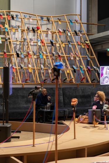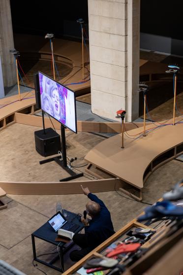 Artiste, auteur et DJ, Jace Clayton aka DJ /rupture célèbre l'œuvre Sole crushing de Meriem Bennani à l'occasion d'une session d'écoute exceptionnelle, où percussions riment avec collectif.