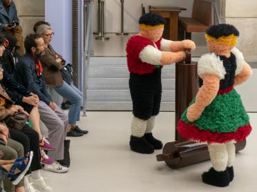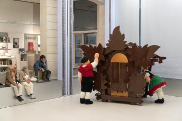 « Deux figurines ou poupées folkloriques s'échappent à heure fixe d'une énorme pendule à décor typique de la Forêt noire. Les deux corps enveloppés de tulle, coordonnés entre eux, effectuent de petits pas dans un profond silence, battent du poignet un rythme que nous ne percevons pas, dodelinent vaguement du chef, s'assoient, se couchent, bougent encore les pieds avant de réintégrer leur chalet couleur chocolat au lait.» Jean-Yves Jouannais