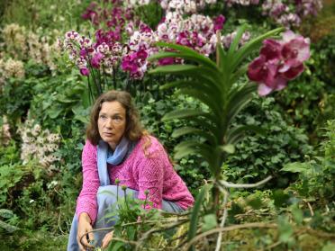 Cette partie de l'exposition s'appelle Lévitation et c'est une œuvre extraordinaire. En fait, c'est la première sculpture que j'ai jamais vue dans ma vie, sculpture, expression artistique qui est faite à partir des plantes. Et c'est une vraie mer et un paysage à la fois, au même moment, magnifique et choquant pour moi, qui travaille avec les plantes. C'est vraiment choquant de voir cette espèce de mélange de plantes ensemble, on ne les trouverait jamais ensemble en vérité, dans la nature. Par exemple, cette vague d'orchidées est issue d'une serre et elles ne se trouveraient jamais ainsi par terre envahie par le lierre. Alors ça me procure un malaise et ça me travaille et je me demande : « mais qu'est ce qu'on a fait avec les plantes ? » Il y en a des très sauvages ici, vraiment, qui sont issues vraiment de la nature directement et des trucs complètement fabriqués par les hommes. On voit même toujours les tuteurs ici pour les mettre dans cette position. Mais pour moi, la « lévitation », c'est qu'elles vont s'enfuir. Elles vont fuir la terre. L'orchidée, normalement tombe en cascade du haut des arbres. Et là, je crois, on voit ça là-bas, où les orchidées commencent à monter et s'enfuir vers le haut.