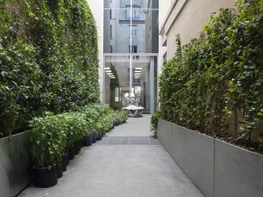L’installation L’Expansion de Marguerite Humeau recouvre les murs de la cour de plantes grimpantes, qui évoquent la violence faite à l’autre.