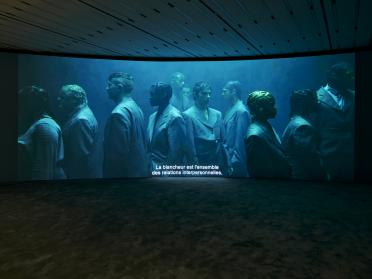 Une phrase récurrente du film, «Le monde est terre sèche, la terre est d’eau», propose un «monde» fait de sociétés et de cultures en relation avec la terre. D’autres performeur·euse·s se déplacent et traînent des corps consentants à travers un espace intérieur constitué d’eau boueuse, entre la mort et la résurrection.
